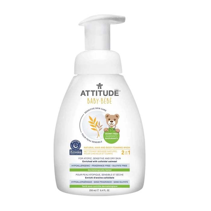 From birth, babies are sponges of knowledge. The more you speak and play with them, the better they will do in school and life. Because their skin is thinner, they're also sponges for what's in their environment. ATTITUDEs Sensitive Skin 2-in-1 Natural Hair & Body Foaming Wash is formulated for babies with exceptionally delicate exteriors. With the practical and easy-to-use pump, our sulfate- and the worry-free formula is made to keep their extra sensitive skin extra happy using natural ingredients like calming colloidal oatmeal to relieve dry, irritated scalps and skin. It's certified by the National Eczema Association and EWG Verified because we only want the best for you and your family.