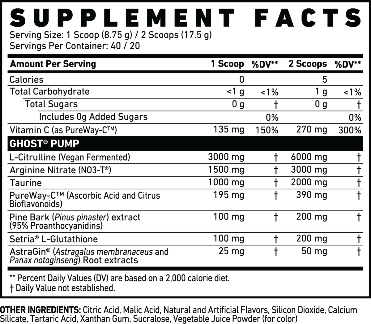 How to Use : Mix one scoop (1 serving) of GHOST® PUMP with 6-8 oz of water or beverage of choice, such as GHOST LEGEND®, 30 minutes before exercise on training days. Advanced users/users over 160lbs, mix 1-2 scoops with 10-12oz of water prior to training.