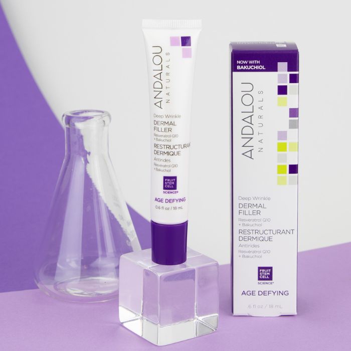Visibly reduce fine lines and deep wrinkles with Andalou Naturals Age Defying Deep Wrinkle Dermal Filler. Infused with Fruit Stem Cell Science, Resveratrol, and CoQ10, this targeted wrinkle treatment plumps, firms, and smooths the skin for a youthful, radiant appearance. Ideal for mature and dry skin types, it delivers a lifting effect that restores elasticity and refines texture — for visibly younger-looking skin every day.