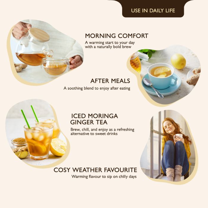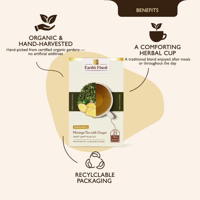 Earth’s Finest Organic Moringa Tea With Ginger Tea is made from the finest leaves harvested from tender organically grown Moringa Trees in the tropics of Sri Lanka. The finest leaves are handpicked and sun dried preserving its goodness and nutrition. Moringa is a Superfood that provides many health benefits and has been used in ancient Sri Lankan Ayurveda recipes for thousands of years.