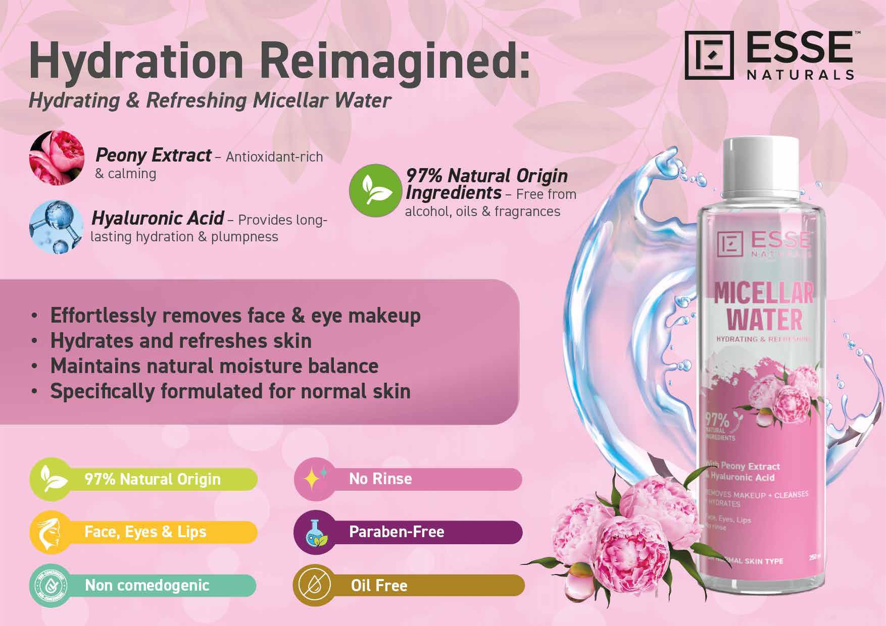 Esse Beauty Micellar Water Hydrating & Refreshing, 97% Natural Origin Makeup Remover for Normal Skin, 250ml
