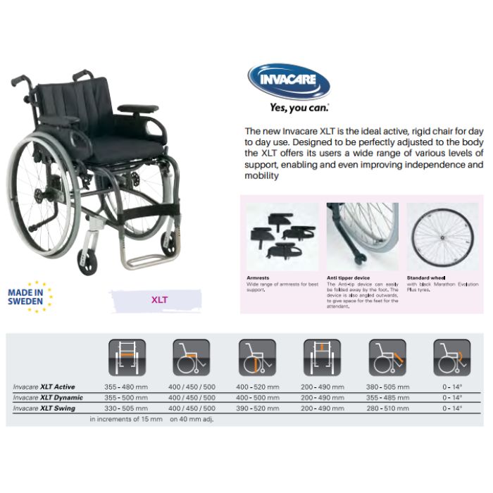 The new Invacare XLT is the ideal active,rigid chair for day to day use. Designed to be perfectly adjusted to fit the body the XLT offers its users a wide range of various levels of support, enabling and even improving independence and mobility.