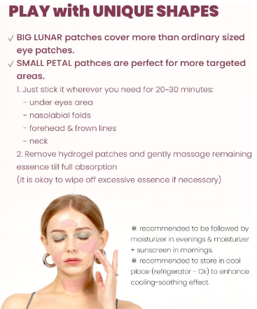 - Big patches: Place the bigger patches on the skin around the eyes. Larger pieces deliver intensive care to wider skin area than standard eye patches.