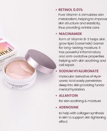 Anti-wrinkle with Retinol: Pure vitamin A, Retinol stimulates the metabolism, working to improve skin structure and elasticity, reduce wrinkles. Big patches to cover more: Larger pieces deliver intensive care to wider skin area than standard eye patches. Small patches for areas in care-need: Smaller pieces provide intensive care to more specific areas as smile, frown, and neck. — RETINOL enriched skin firming formula Pure vitamin A, Retinol stimulates the metabolism, working to improve skin structure and elasticity, reduce wrinkles, and prevent skin dullness and roughness. Retinol enriched formula improves skin elasticity and complexion simultaneously providing instant hydration.