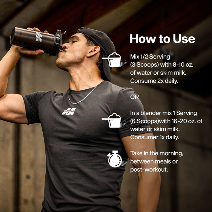 Mix 1 serving with 20–24 oz of water or milk and consume once daily. For best results, take immediately after workouts or between meals to support calorie intake and muscle recovery. Adjust serving size based on individual calorie requirements and training intensity.