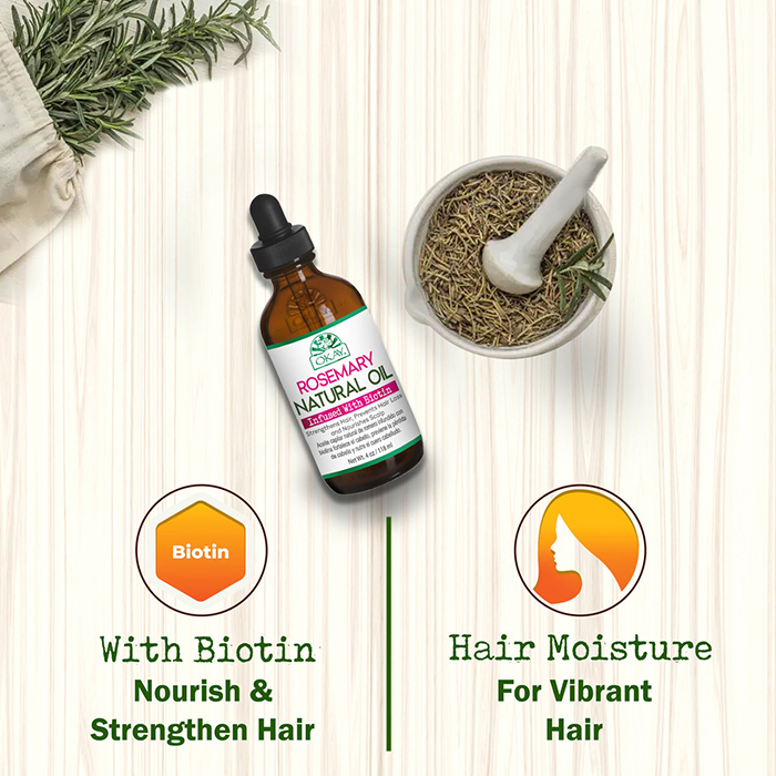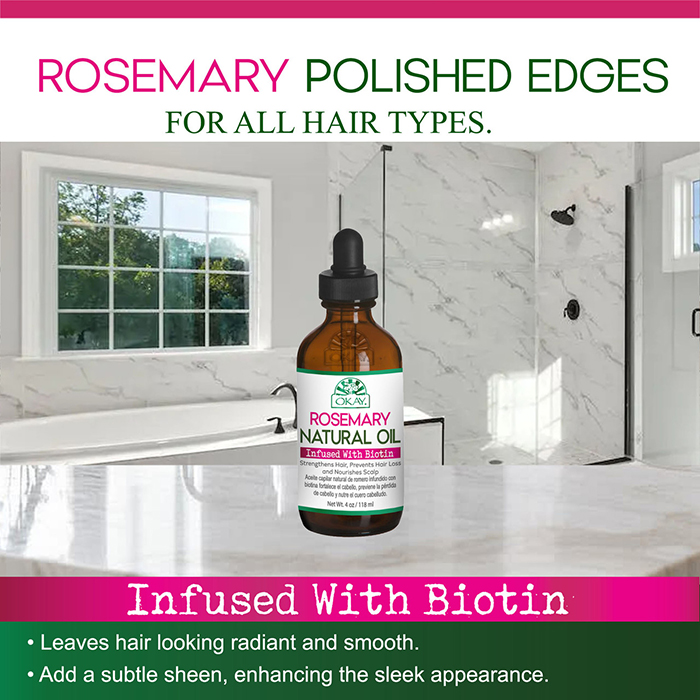 OKAY Rosemary natural oil, infused with biotin is specially formulated to help prevent hair loss by strengthening hair follicles and nourishing the scalp. Suitable for all hair types, it promotes stronger, healthier hair.