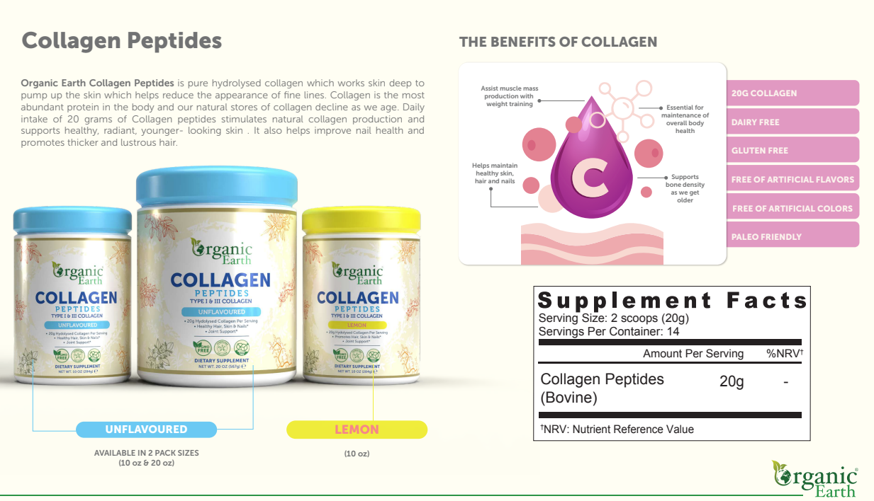 Each 21g serving of Organic Earth Collagen Peptides delivers highly bioavailable collagen peptides that stimulate natural collagen synthesis, improving skin elasticity, hydration, and firmness in as little as 8–12 weeks. Beyond skincare benefits, collagen also strengthens nails, promotes thicker, shinier hair, supports bone density, aids gut health, and assists in building lean muscle mass when combined with weight training.