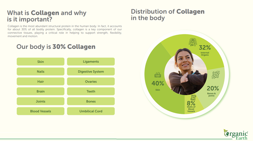 Organic Earth Collagen Peptides Lemon is a premium, hydrolysed collagen formula crafted to work from within for complete body wellness. Collagen is the most abundant protein in the body, making up nearly 30% of all proteins, yet production naturally declines after the age of 30. This decline contributes to visible signs of aging such as wrinkles, fine lines, brittle nails, thinning hair, and joint stiffness.
