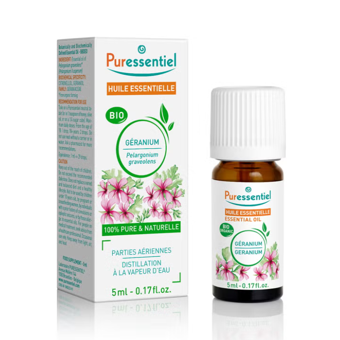 Puressentiel Essential Oil Geranium 5ml is a pure, organic essential oil with a floral, uplifting scent. Known for its balancing and soothing properties, it is perfect for enhancing mood and supporting skin health.