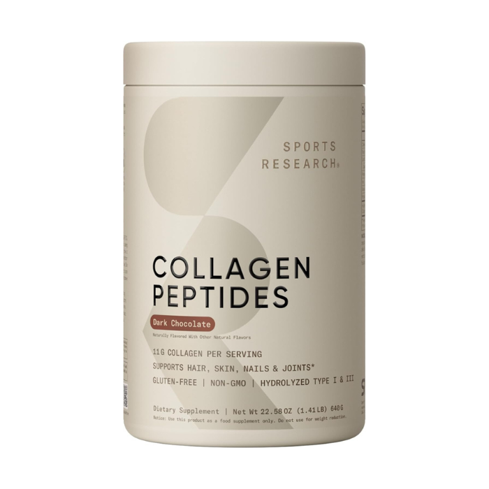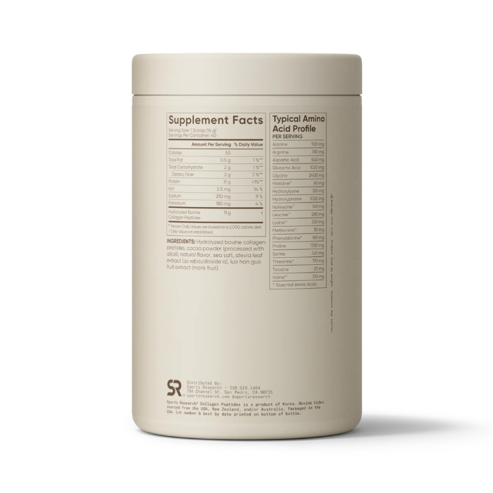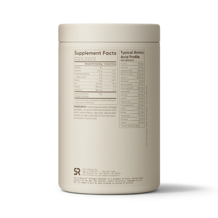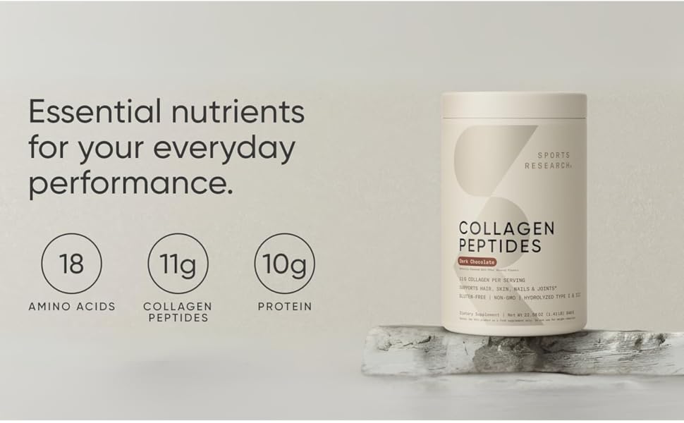 Sports Research Collagen Peptides Dark Chocolate Powder is a premium dietary supplement designed to support daily wellness, beauty, and active lifestyle needs. This hydrolyzed collagen formula is crafted to mix smoothly into beverages such as coffee, smoothies, or shakes, making it a convenient addition to your daily routine. Collagen is the most abundant protein in the human body and plays an essential role in maintaining the structure and function of skin, nails, joints, and bones. However, natural collagen production gradually declines with age. This formula provides 11 grams of hydrolyzed Type I & III collagen peptides per serving, along with 18 naturally occurring amino acids, helping support the body’s collagen needs.