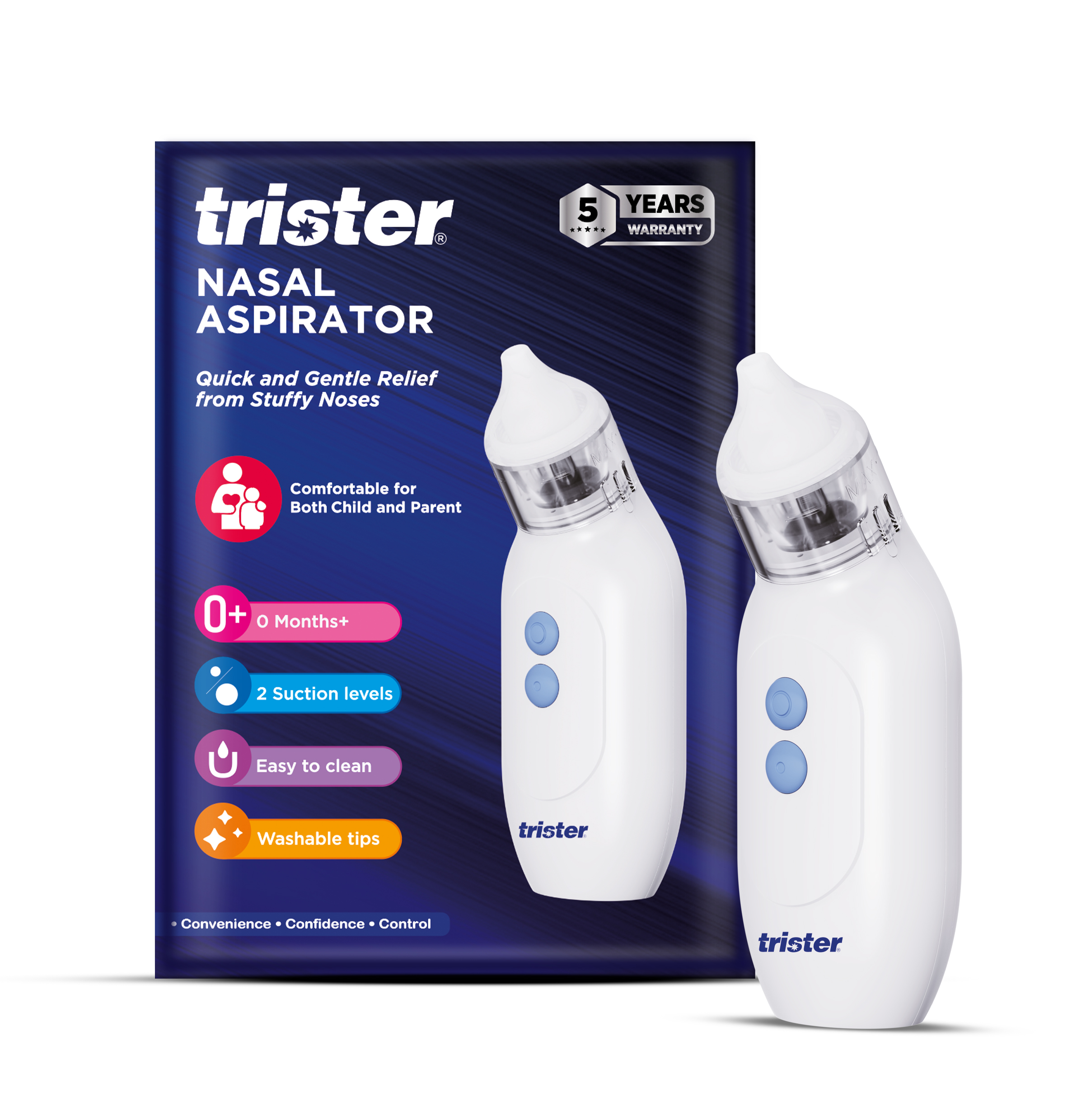 Trister Nasal Aspirator gently clears nasal mucus and blockages in infants and children for quick, comfortable relief from congestion. Designed with two adjustable suction levels and four washable, soft silicone tips for different age needs. Easy to clean, safe for home use, and gentle on delicate noses — making nasal care stress-free for parents and babies alike.